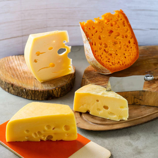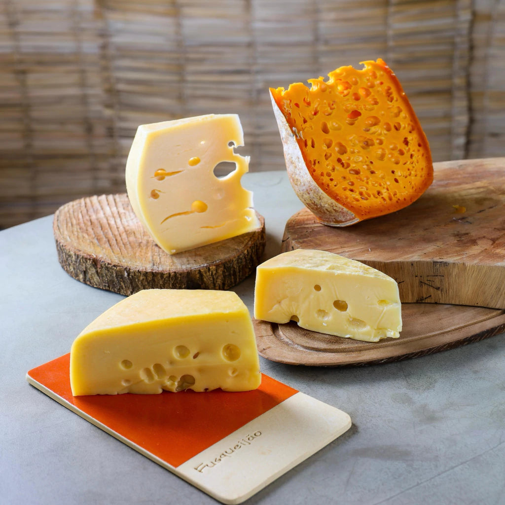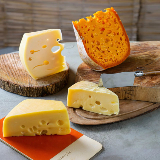 Explore o universo fascinante dos queijos com olhaduras – aqueles “furinhos” encantadores que surgem durante a maturação a partir da fermentação propiônica. Esse kit reúne quatro queijos artesanais premiados e de identidade única, cada um com textura envolvente, aromas elegantes e sabores que vão do adocicado ao levemente picante.