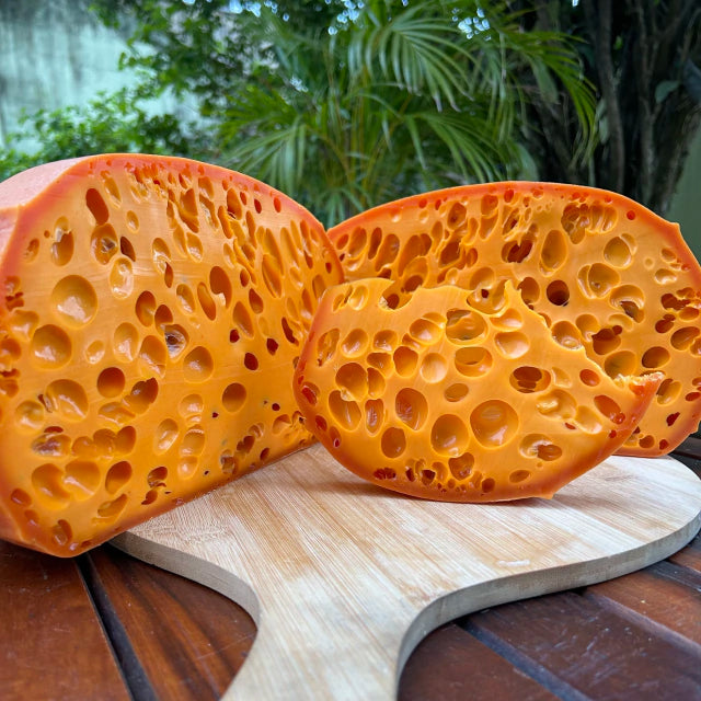 Produzido pela premiada Fazenda Atalaia em Amparo, São Paulo, o Queijo Figueira é uma verdadeira obra-prima artesanal. Maturado por aproximadamente 120 dias, sua cor alaranjada vibrante é resultado do acréscimo de urucum natural na massa. Este queijo, que parece ter saído de um desenho animado, encanta com sua textura cremosa, fermentação propiônica suave e sabor levemente adocicado, que envolve o paladar.